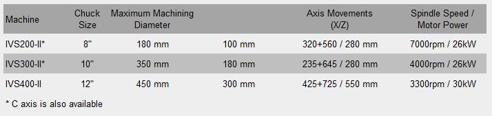 IVS series is designed for mass production applications. With high speed X-axis rapid traverse and a moving headstock that directly picks up work pieces from a work conveyor so that a gantry robot is not necessary. Automatic production systems can be implemented for mass production of mid to small size lots by not only stand-alone machines but also by connected machines.